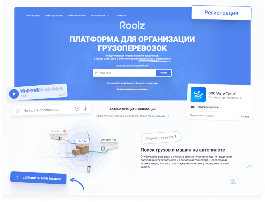 Для транспортно-логистических компаний, стремящихся к расширению партнерских связей и снижению затрат. Если вы считаете, что бизнес не должен стоять на месте, попробуйте Roolz. Создать свой профиль в системе могут собственники грузов, экспедиторы, перевозчики, частные предприниматели.