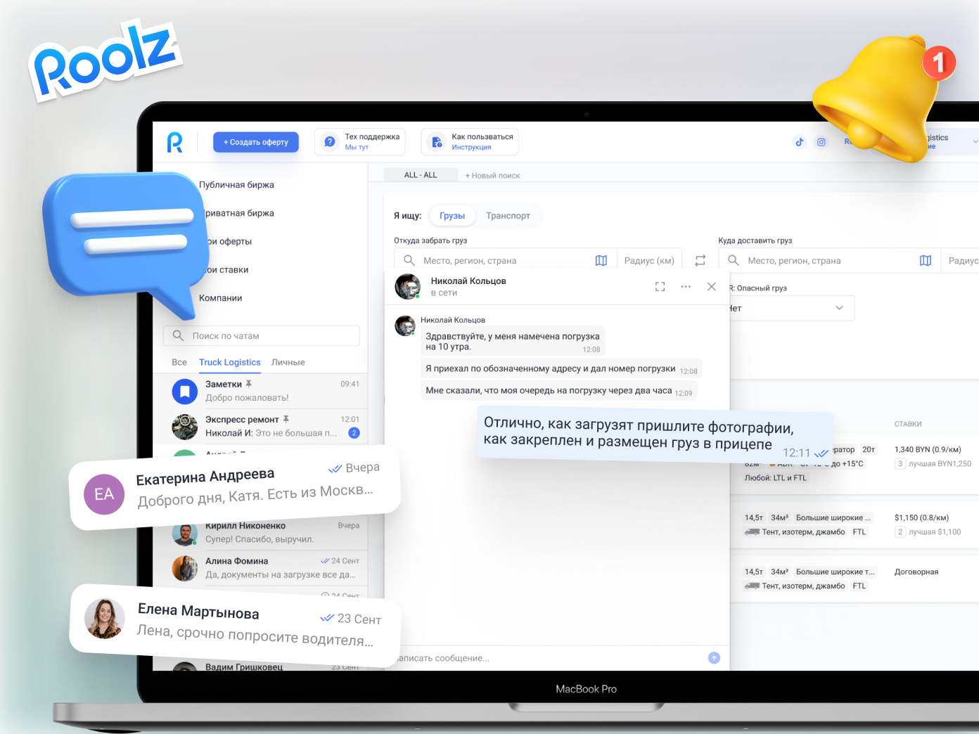 В Roolz мы уверены: логистика будущего — это не только про скорость доставки, но и про мгновенную, прозрачную коммуникацию. Именно поэтому в новом обновлении платформы мы представили бизнес-мессенджер Roolz — инструмент, созданный с учётом всех реалий и потребностей участников транспортной логистики.