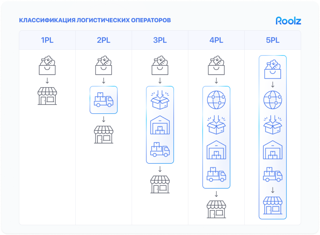 Чем выше уровень логистического оператора, тем шире его зона ответственности и тем больше элементов цепочки поставок он берет на себя — от отдельных операций до комплексного управления логистикой и ее интеграции с бизнес-процессами компании.