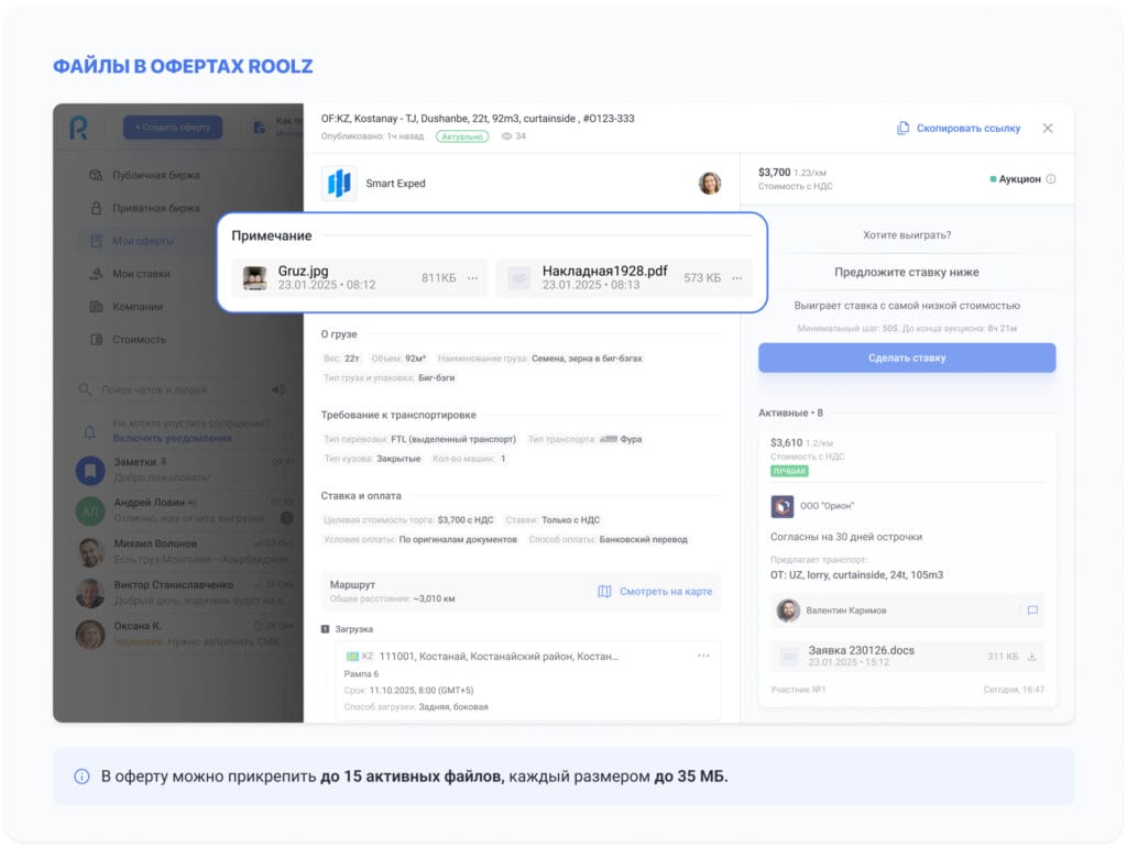 По запросу пользователей мы добавили возможность прикреплять файлы прямо в оферты Roolz — как грузовые, так и транспортные, во всех режимах торгов, включая объявления. Теперь все материалы по перевозке можно собрать и хранить в одном месте — внутри оферты.