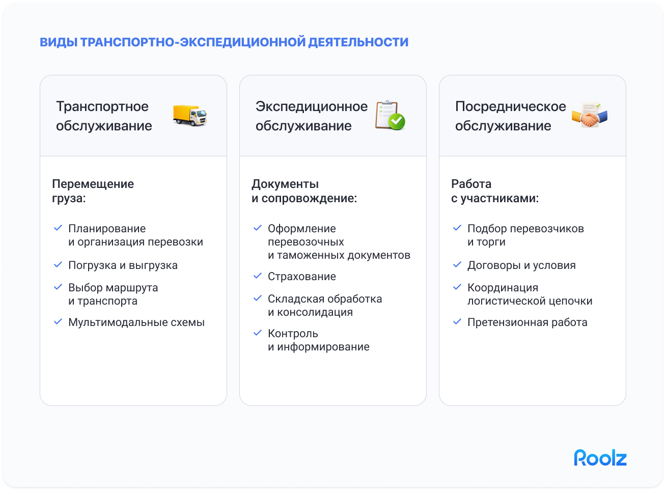 В этой статье мы подробно разберём, что такое транспортно-экспедиционная деятельность (ТЭД) с точки зрения закона и практики, какие виды услуг она включает и как выстраивается работа экспедитора. Бонусом — покажем, как платформа Roolz помогает организовать транспортно-экспедиционную деятельность.