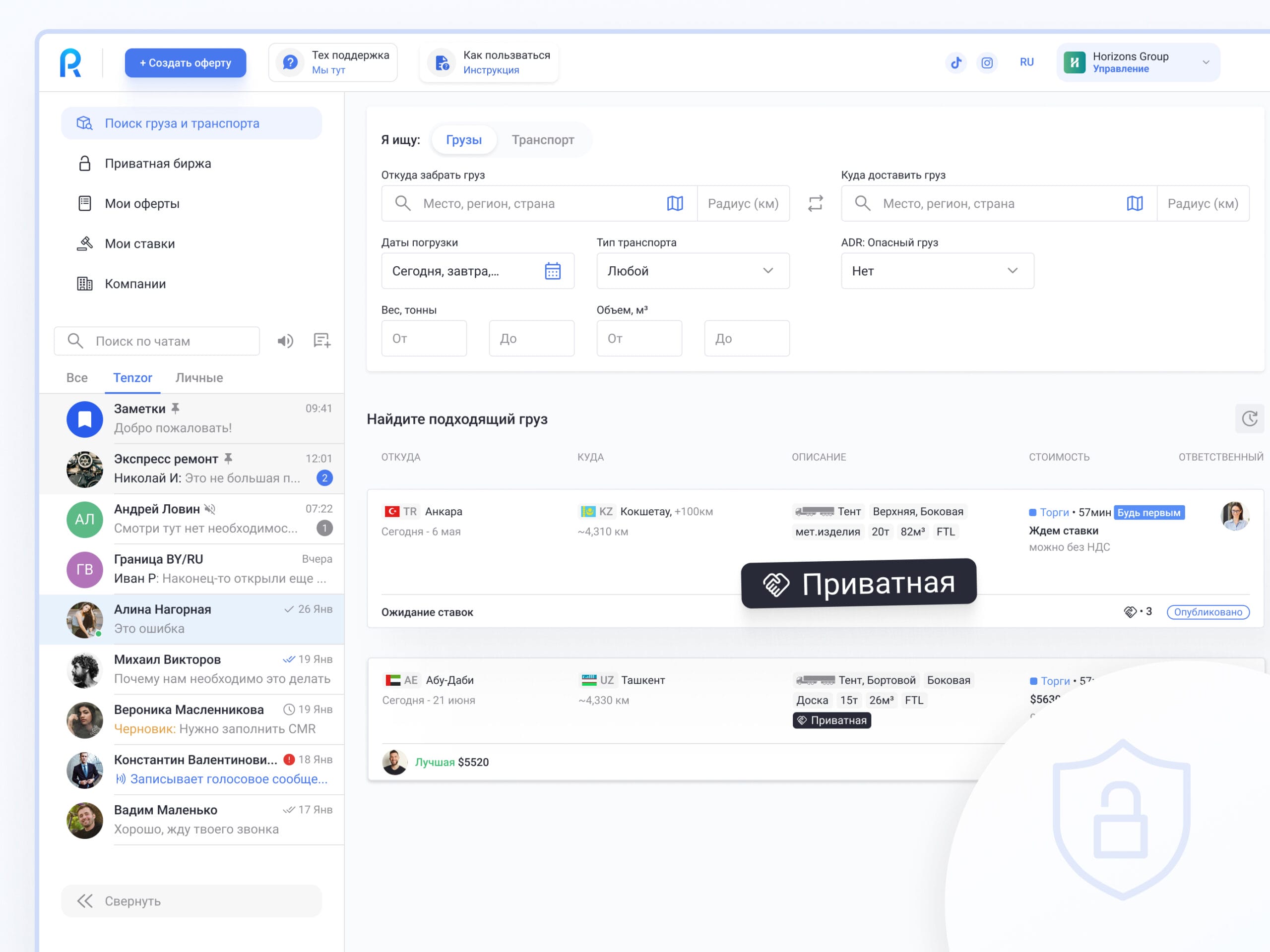 Теперь в разделе «Поиск груза и транспорта» вы можете сразу увидеть, какие оферты размещены вами или вашими проверенными партнёрами в приватной бирже. Такие предложения выделяются маркировкой «Приватная»— они видны только отправителям и получателям внутри доверенного круга.