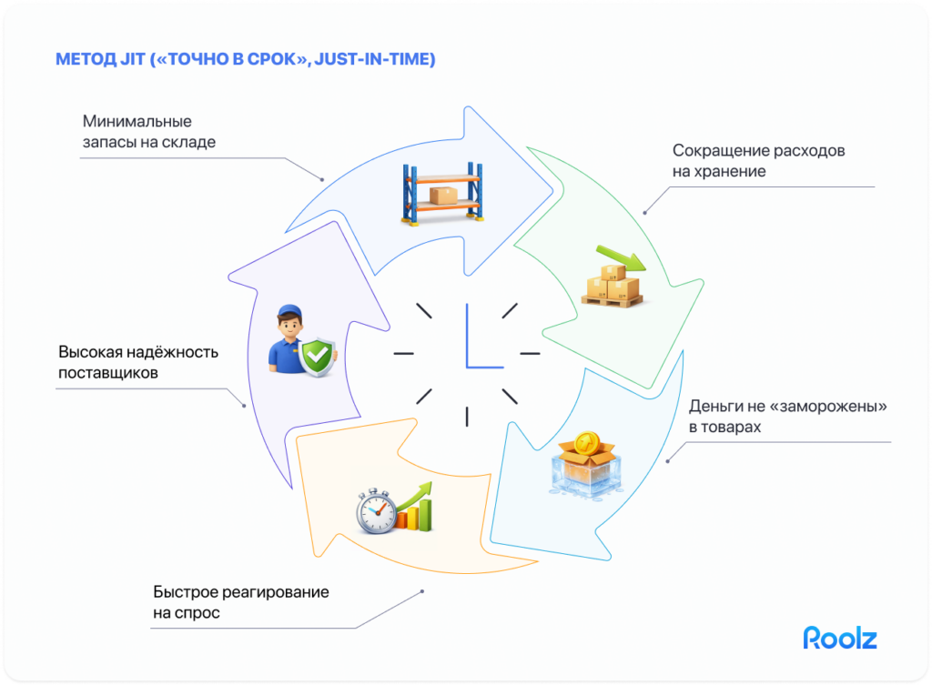 Концепция Just-in-Time предполагает поставку материалов или товаров непосредственно к моменту их использования. Основная цель — минимизировать складские объёмы. Это помогает снизить затрат на хранение, ускорить оборачиваемости капитала, уменьшить складских площадей. Метод имеет высокую зависимость от надёжности поставщиков и транспорта, сбоев в цепи поставок. Поэтому требует точной координации процессов и стабильного спроса.