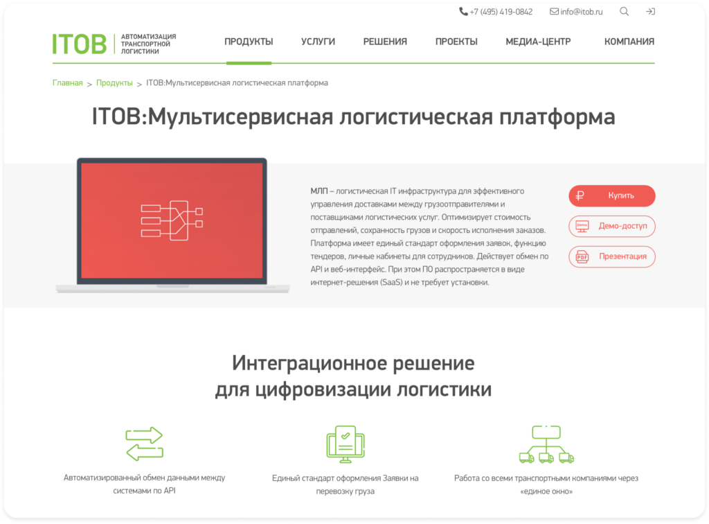 ITOB — разработчик мультисервисных IT-решений для бизнеса, включая продукты для логистики и управления цепочками поставок. Среди их разработок — мультисервисная логистическая платформа (МЛП), предназначенная для оптимизации доставки грузов между отправителями и логистическими операторами.