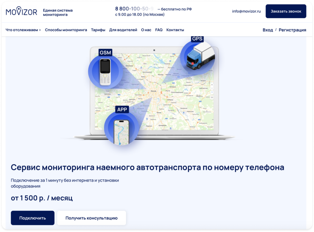 Мовизор — это единая система мониторинга наемного транспорта. Сервис помогает отслеживать грузовые перевозки автомобильным и железнодорожным транспортом, перемещение курьеров и водителей. Подключение к мониторингу возможно удаленно — явка водителя в офис не нужна, как и наличие дополнительного оборудования. Технологии подключения: wi-fi, GPS и GSM (по номеру телефона).