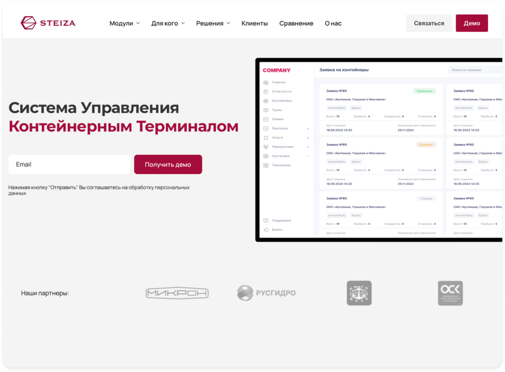 STEIZA — программное решение для автоматизации работы грузовых терминалов и контейнерных площадок. Система помогает оптимизировать процессы хранения, обработки и перемещения контейнеров, контролировать транспорт и сотрудников, а также вести полный документооборот. Программа доступна в мобильной версии и может включать любые индивидуальные модули под потребности бизнеса.